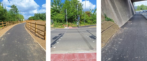 This wide hard surfaced path leads you towards the A3(M) junction/Rusty Cutter roundabout. Here you will find a succession of signalised crossing points connected by short sections of path, please see the images below.