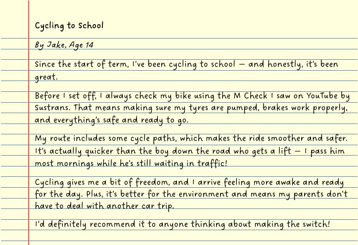 Do you cycle to school once a week? Use Park and Stride every day? Or maybe you took the bus to the shops for the first time? By sharing how you travel, what you enjoy and any tips for others, you can inspire change. Plus, pupils and schools could win a prize by entering our competitions!