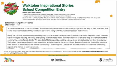 Walktober is a challenge held each October to celebrate International Walk to School Month. School communities are encouraged to get moving for Walktober by walking, wheeling and using other active and sustainable travel as much as possible throughout the month. In Hampshire, Walktober has been run annually by Hampshire County Council's Travel Planning Team since 2016.